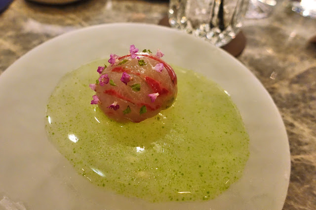 Mixing and matching western and Asian cooking techniques and ingredients with the contemporary-style presentation has been the signature play of Chef Vicky and formed the basis of his menu served at the restaurant. Our first course was shimaji, or striped jack, with the "blob" of tartare wrapped with sashimi slices dotted with shiso and shiso flower with a lemon balm-longan syrup in semi-frozen gel consistency served in a frozen plate. The short-necked clams was a common item found in local seafood market and here it's served with Taiwanese candied tomatoes with the herb-infused creamy clam juice sauce and burrata "pearls". One off-menu course was brought to us afterwards, which is a "sushi" served in a small bowl with XO sauce, local oyster escabeche, squid and also albacore tuna from Chef Vicky's adopted hometown of Vancouver. All of them were refreshing with interesting flavor combination.